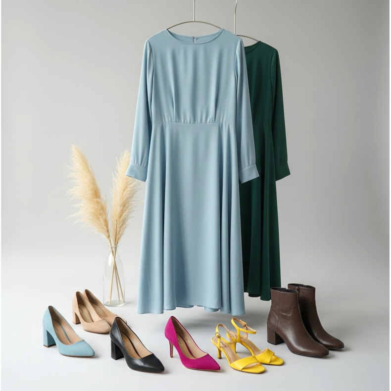 När det gäller A-linjeklänningar i ljusa färger kommer skor i liknande nyanser att fungera bäst då de optiskt förlänger siluetten. Du kan dock bära både ljusa och mörka skor med mörka klänningar – allt beror på vilken effekt du vill uppnå.