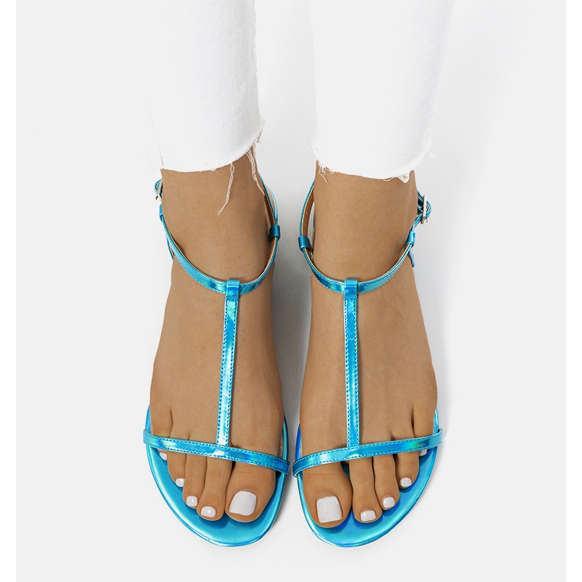Adelia är sandaler som är perfekta för både promenader och sommarevenemang. Oavsett tillfälle kommer dessa holografiska sandaler att framhäva din individualitet och stil. Boka lite lyx till dig själv till sommaren med Adelia blå platta holo-sandaler!