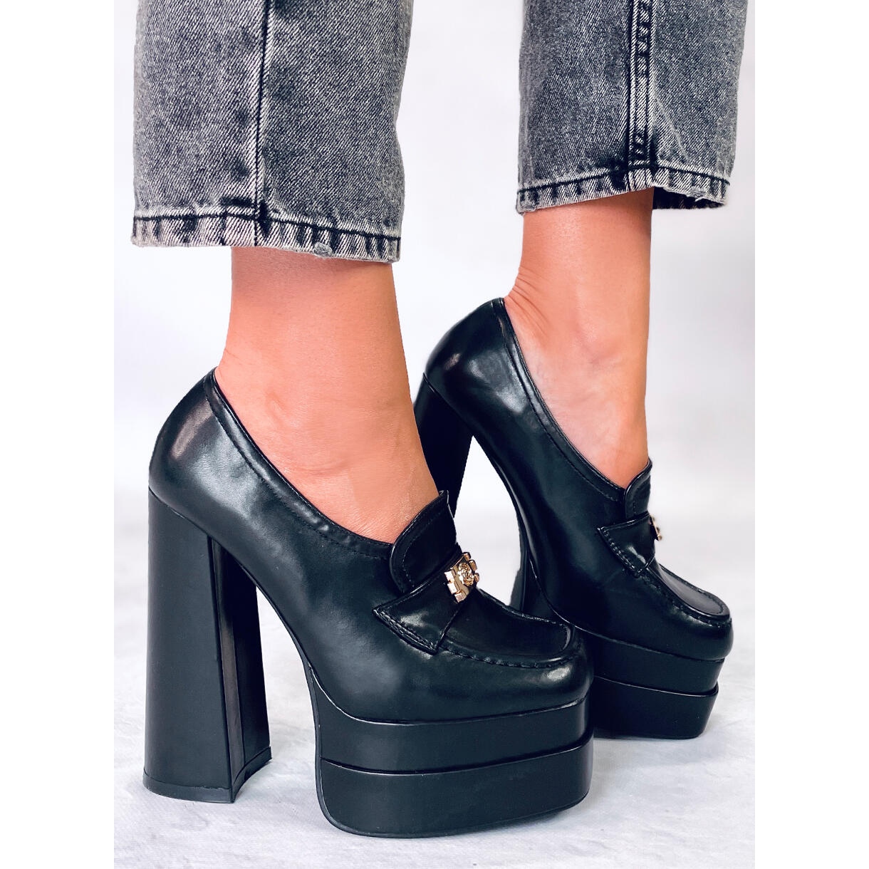 Ambra Black Heels - Svart, elegant och modig. Fäktning med höghöjda kvinnors loafers (14,5 cm) med en plattform på 5 cm är ett förslag för kvinnor som vill lägga till höjd och karaktär, inte ge upp komfort. Modellen i universell svart med en fyrkantig näsa och dekorativa zirkoner kommer att vara bra för speciella tillfällen och i stadsstyliseringar.