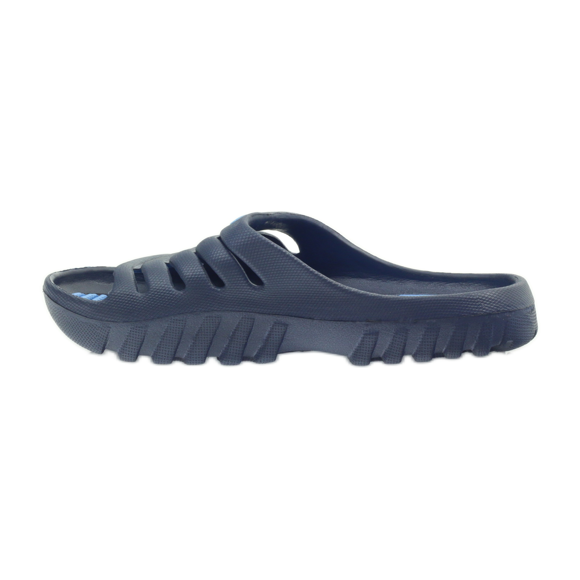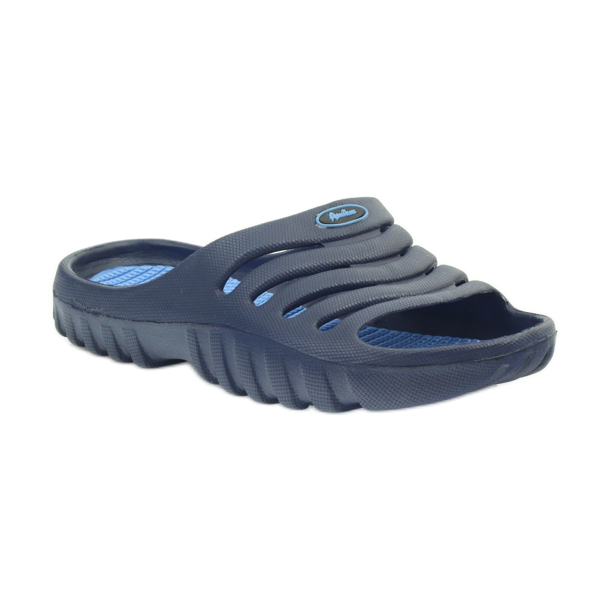 Dessa marinblå flip-flops kännetecknas av en intressant form på ovandelen, och tillverkarens logotyp ger dem karaktär. Insidan av skorna i en intensiv blå färg med en profilerad sula garanterar att ditt barns fötter får tillräckligt stöd och komfort hela dagen.