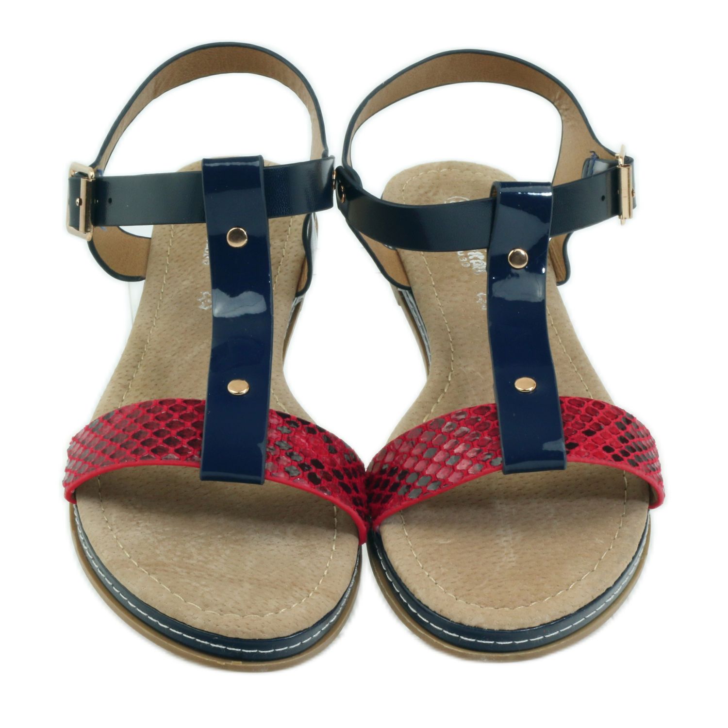 Deras klassiska design utan tå och en platt 1,8 cm klack gör sandalerna inte bara eleganta, utan också väldigt praktiska för vardagsbruk. Spännets stängning säkerställer enkel på- och avtagning, och den intressanta kombinationen av röda och marinblå färger skapar en originell och attraktiv design.