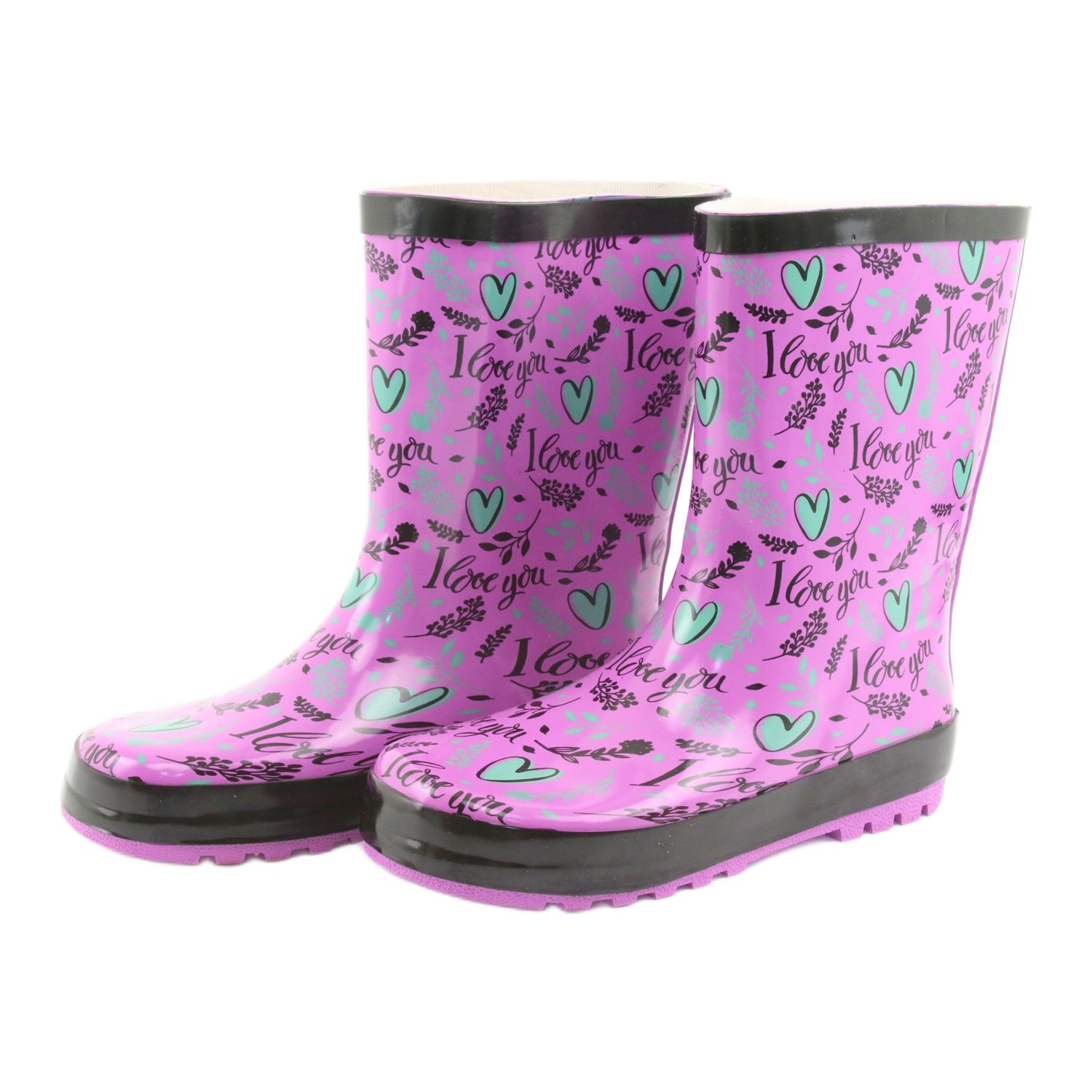American Club Wellington-stövlar med lila hjärtan är det perfekta valet för regniga dagar för små fashionistas! Tillverkade av högkvalitativt gummimaterial ger de inte bara ett utmärkt skydd mot vatten, utan också komfort att bära tack vare extra insatser. En intressant kombination av färger - djuplila med gröna hjärtan och en klassisk svart accent - gör att gummistövlarna säkerligen lockar uppmärksamhet och gläder varje barn.