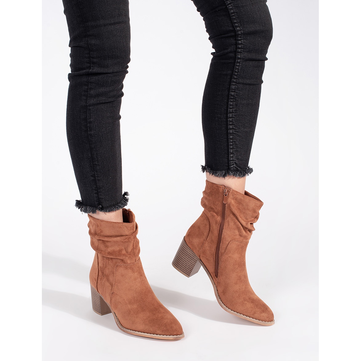 Brown Suede Boots på stolpen med en skrynklig övre är ett utmärkt val för varje fashionabel kvinna som värderar komfort och stil. Dessa eleganta skor från ett annat varumärke kombinerar modern design och funktionalitet och passar perfekt in i en avslappnad look varje dag.