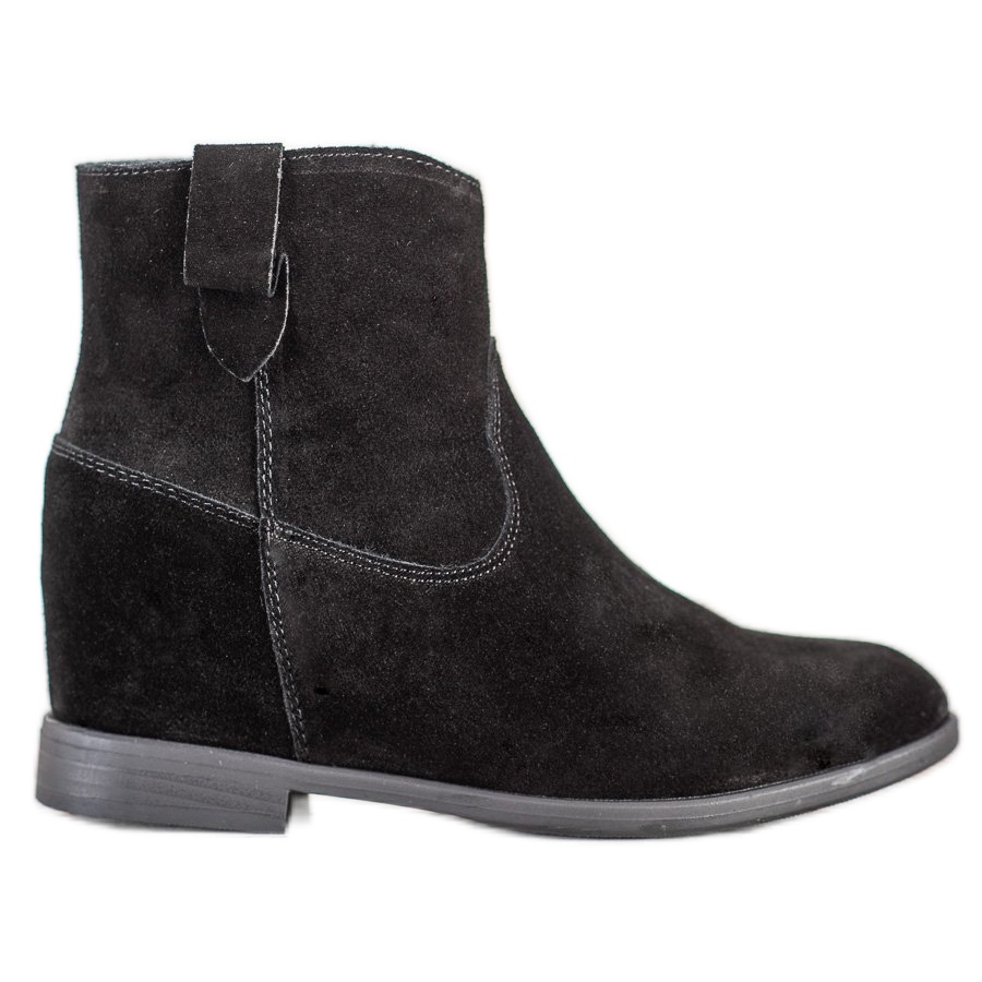Tack vare en rund tå och en inbyggd, mjuk klack ger dessa skor maximal bärkomfort. Den höga 8 cm kilen framhäver figuren perfekt, och den släta, syntetiska sulan ger stabilitet vid varje steg. Stövlarna har också isolering, vilket gör dem till ett idealiskt val för höst-vintersäsongen.