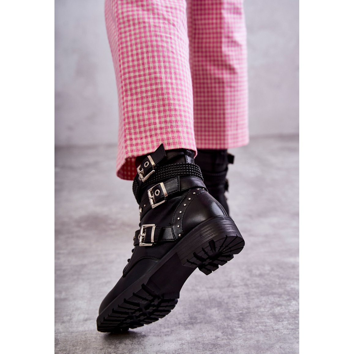 Snygga, svarta stövlar gjorda av högkvalitativa ekologiska läder. Den övre dekorerade med justerbara ränder med spännen, dubbar och zirkoner som lägger till karaktär och subtil glöd. Modellen fästes med en blixtlås och dessutom snörd, tack vare vilken den perfekt anpassar sig till foten. Interiören fodrad med en mjuk skorfilt ger värme och komfort på svalare dagar. En känslig plattform och en platt häl med en höjd av cirka 3,5 cm garantistabilitet vid varje steg. Stövlarna räcker till vristen och har en rundad näsa.
