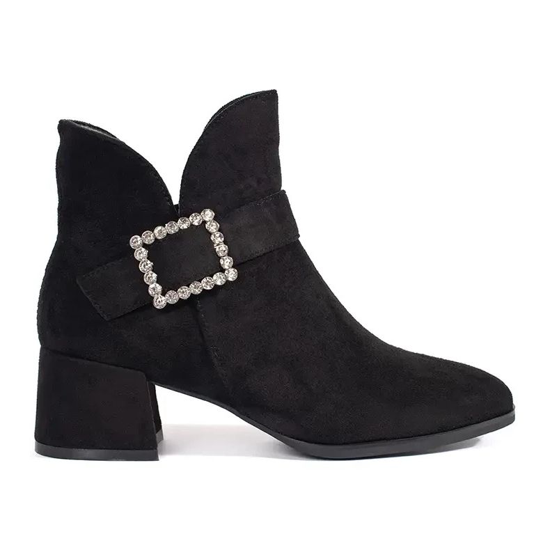 Ankelstövlar, utrustade med en praktisk skjutreglage, garanterar bekväm att ta på sig och ta fart. Den förstyvade hälen och noggrant tillverkad yttre material gjord av ekologisk mocka säkerställer komfort och hållbarhet, och ytterligare accenter i form av ett silverspänne och zirkon ger en elegant karaktär.