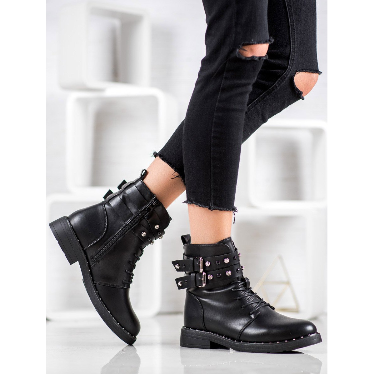 Tillverkad av ekologiskt läder av hög kvalitet, arbetare ser inte bara imponerande ut utan är också miljövänliga. Deras kompakta, runda tår och uppbyggda, förstyvade häl garanterar inte bara ett snyggt utseende, utan också stabilitet och komfort. De har ytterligare estetiskt värde tack vare dekorativa spännen, strass och strass, som väcker uppmärksamhet och framhäver deras unika stil.