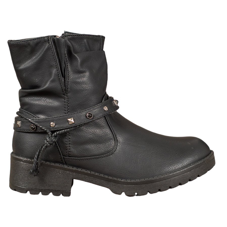 Tillverkad av ekologiskt läder, arbetarna kännetecknas av en solid konstruktion. Deras estetiska finish och dekorativa rem dekorerad med strass och pärlor gör att dessa skor sticker ut från andra modeller. En platt 4 cm hög klack och en 2 cm plattform gör skorna inte bara moderiktiga utan också bekväma. Dragkedjan möjliggör snabb på- och avtagning, och den höga övre räckvidden ovanför ankeln understryker ytterligare deras rockkaraktär.