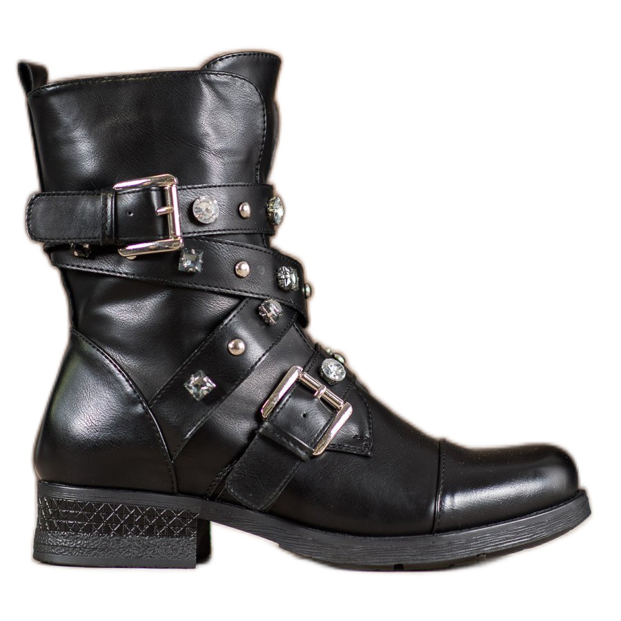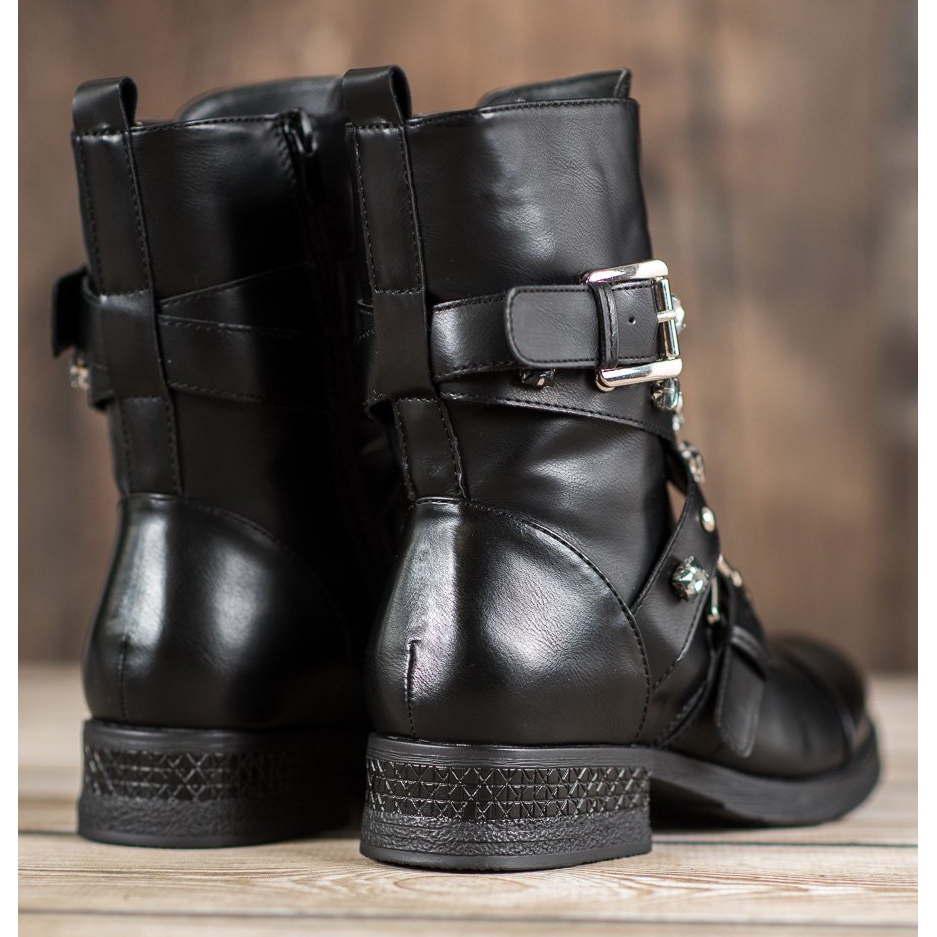 Svarta Kayla-arbetare med en dekorativ rem är det perfekta valet för kvinnor som vill lägga till en rockig accent till sin garderob. Dessa snygga stövlar kombinerar komfort med original design och blir ett perfekt komplement till både avslappnade och mer eleganta stilar.