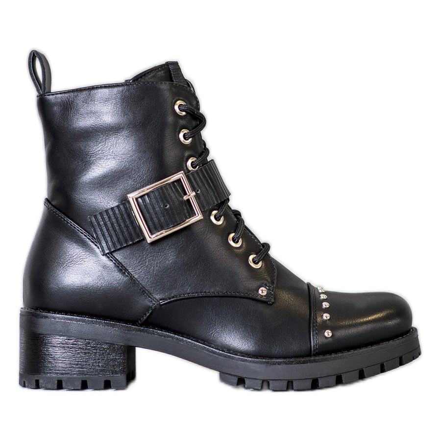 Dessa skor kännetecknas av intressant snörning framtill och en praktisk dragkedja i sidan, vilket gör det lättare att ta av och på skorna. Dessutom lägger ett dekorativt bälte med ett spänne och strass en rockig accent till stylingen, perfekt för kvinnor som gillar att sticka ut från mängden.
