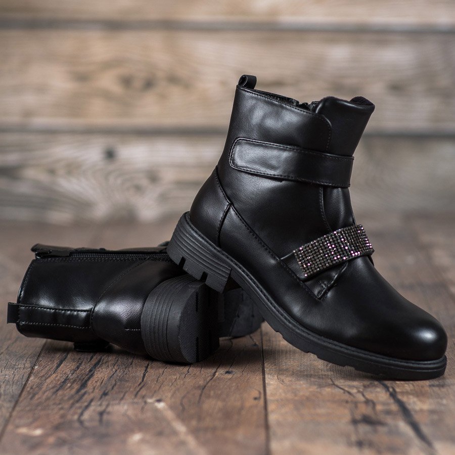 Vi presenterar Evento Workery-skorna med kristaller i svart - den perfekta kombinationen av rockstil och elegans. Dessa ovanliga lågklackade stövlar kommer säkerligen att locka uppmärksamheten från varje självsäker kvinna som uppskattar unik design och komfort att bära.