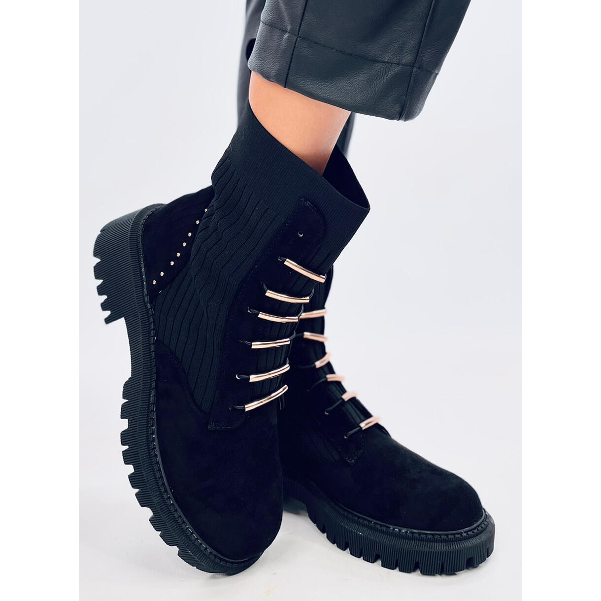 Moderna arbetare som kombinerar komfort och fashionabla design. Den flexibla, sockans övre anpassar sig perfekt till foten, underlättar att sätta på och ge komfort under dagen. Ekologisk mocka i kombination med tyget betonar kvalitetsfinish, och gyllene tappar, strass och subtila strass ger skorna en karaktär - detta är en absolut hit av säsongen.
