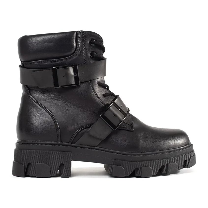 Stylt, bekväma och förberedda för svalare dagar - svarta arbetare med ett dekorativt svart spänne är ett förslag för kvinnor som värderar en avslappnad look med en antydan till elegans. Lackerad Eco -Leather ger dem en elegant glans, och pälsen i insatsen ger ytterligare komfort och uppvärmning.