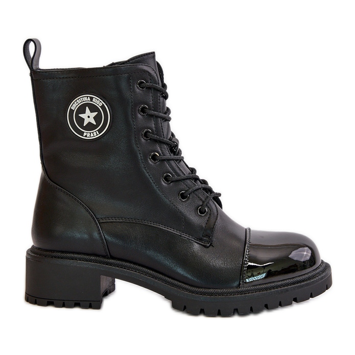 Stövlarna har en rund näsa och en platt häl 4 cm hög, vilket gör dem till ett idealiskt val för kvinnor som värderar både stil och komfort. Det inbyggda tyget ökar ytterligare användningen av användningen. Tack vare den lackerade ytan sticker dessa stövlar ut från andra modeller och lockar deras ögon med deras elegans.