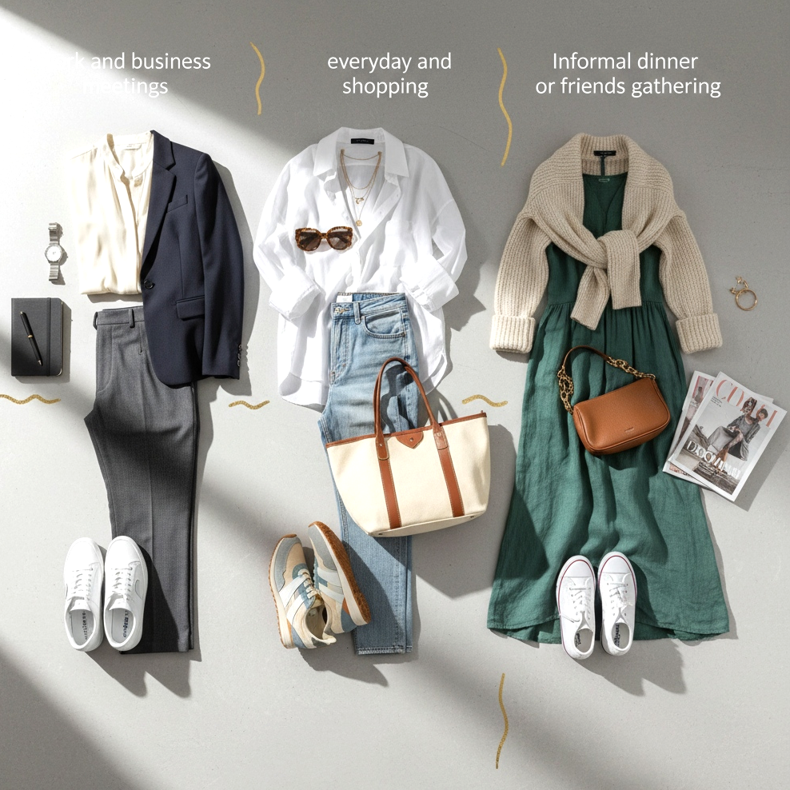 För arbets- och affärsmöten: Vita slim-line sneakers passar perfekt till passformade byxor i nyanser av grått eller marinblått. Till toppen, välj en silkeslen blus eller en minimalistisk jacka. Den här stilen är både professionell och fräsch - perfekt för en ledig fredag på kontoret eller ett möte med en kund i en kreativ bransch.