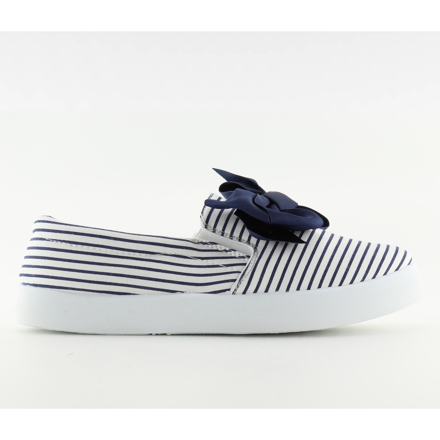 Sailor slipons B860 vit/marinblå - lätta sommarsneakers i sjömansstil, perfekta för semesterpromenader och vardagsstyling. Helt gjorda av tyg njuter de av en klassisk kombination av vitt och marinblått och en dekorativ rosett som ger en feminin karaktär. Den vita, sportiga sulan (plattform/klackhöjd 2,0 cm) framhäver den avslappnade stilen och säkerställer vardagskomfort.