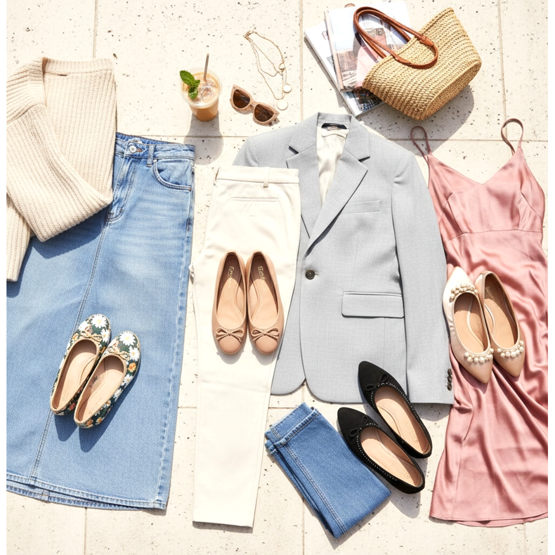 Balettlägenheter är en av de mest mångsidiga inslagen i din vårgarderob. För kontoret: nakna eller beige balettlägenheter med cigarettbyxor och en klassisk jacka skapar en smart casual look som ser både professionell och feminin ut. Modeller och art directors älskade det här utseendet för dess elegans och informalitet på samma gång.