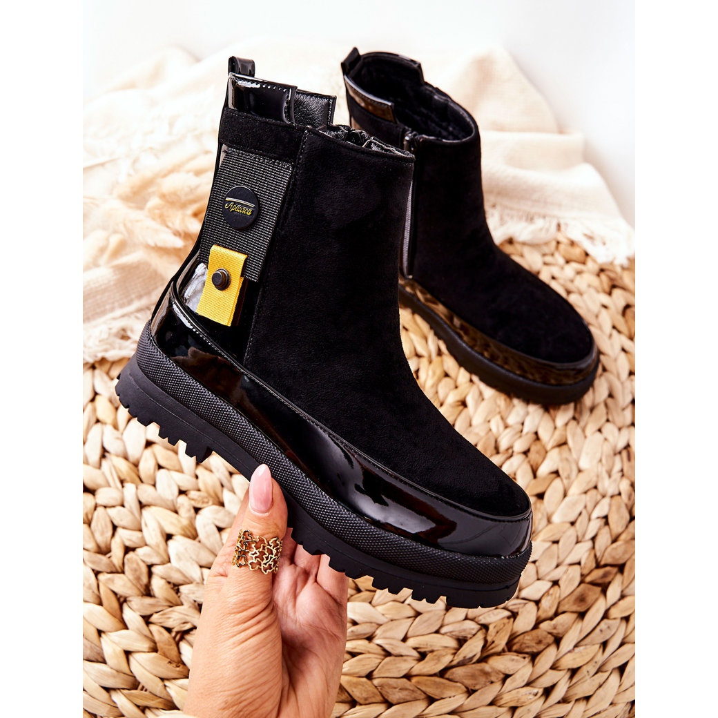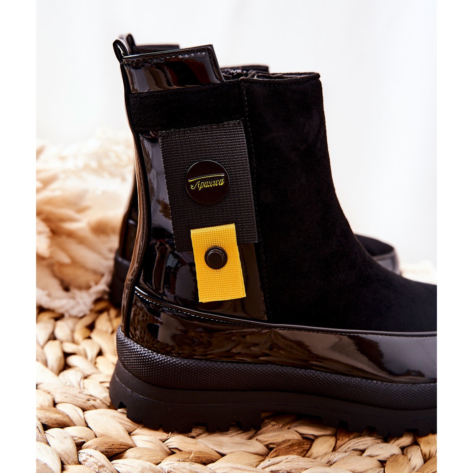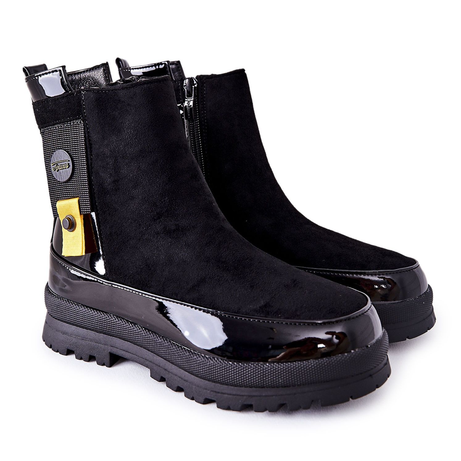 Skornas ovansida är tillverkad av ekologiskt lack av hög kvalitet och mockaimitation, vilket gör att de ser extremt snygga ut. Svarta ankelboots kommer att passa perfekt in i en mängd olika stilar, från avslappnad till mer elegant, vilket ger en touch av chic till vilken outfit som helst.