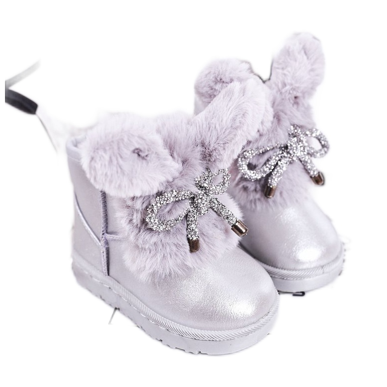 Förbered ditt barn på vintergalenskap med våra eleganta, silverfärgade snöstövlar med pälsisolering och öron! Dessa ovanliga skor ger inte bara komfort och värme under kalla dagar, utan lägger också till stil tack vare paljettapplikationen som säkerligen kommer att glädja varje liten fashionista.