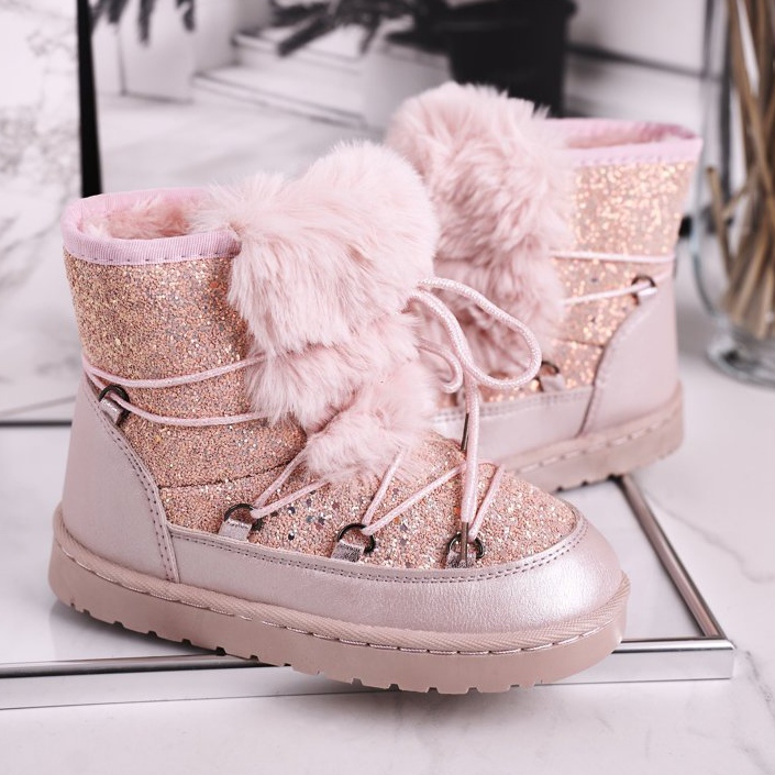 Insidan av skorna är noggrant isolerad med mjuk päls som perfekt täcker fötterna, vilket säkerställer komfort även på frostiga morgnar. De charmas dessutom av elegant glitterdamm, vilket kommer att få varje liten flicka att känna sig speciell.