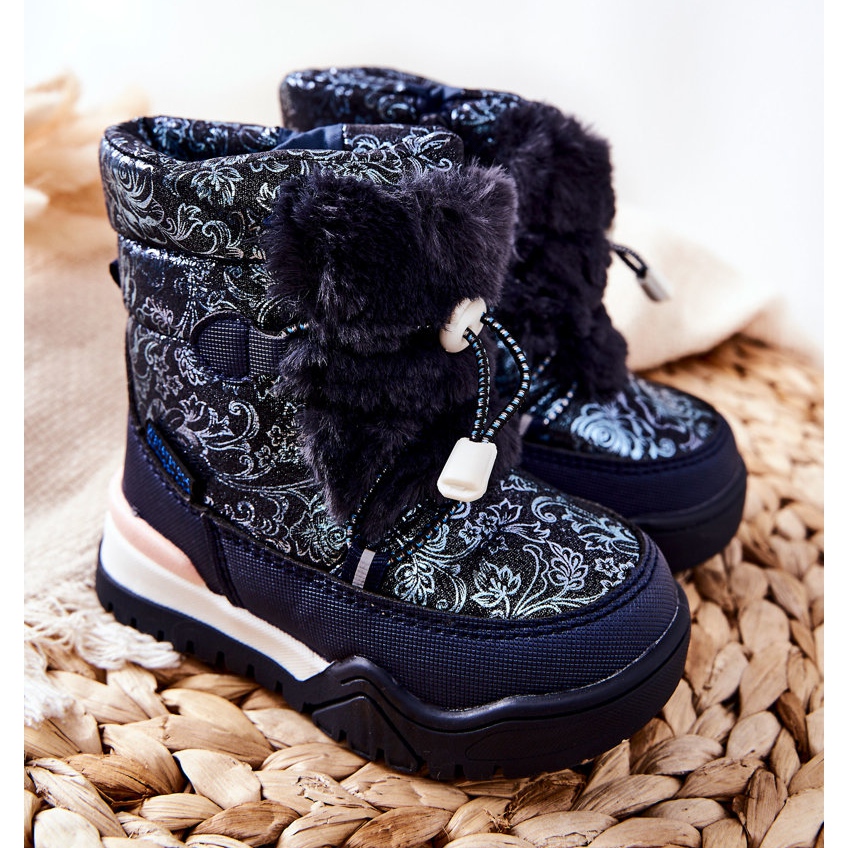 Den spektakulära pälsen på framsidan ger skorna en unik karaktär, och den dekorativa mudden kompletterar den fashionabla designen. Snowboots finns i två attraktiva färger: marinblått och vitt, vilket säkert kommer att tilltala varje tjej.