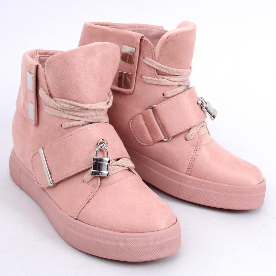 Original Sneakers Basinger Pink är ett förslag för kvinnor som vill kombinera sportkomfort med en modern, glänsande accent. Den höga gummisula döljer en dold häl med en höjd av 4,5 cm, vilket optiskt förlänger benen utan att ge upp bekvämligheten med vardagligt bruk. Metallinsatser och skimrande snören ger skorna en unik karaktär, och subtila strålar betonar det snygga utseendet.
