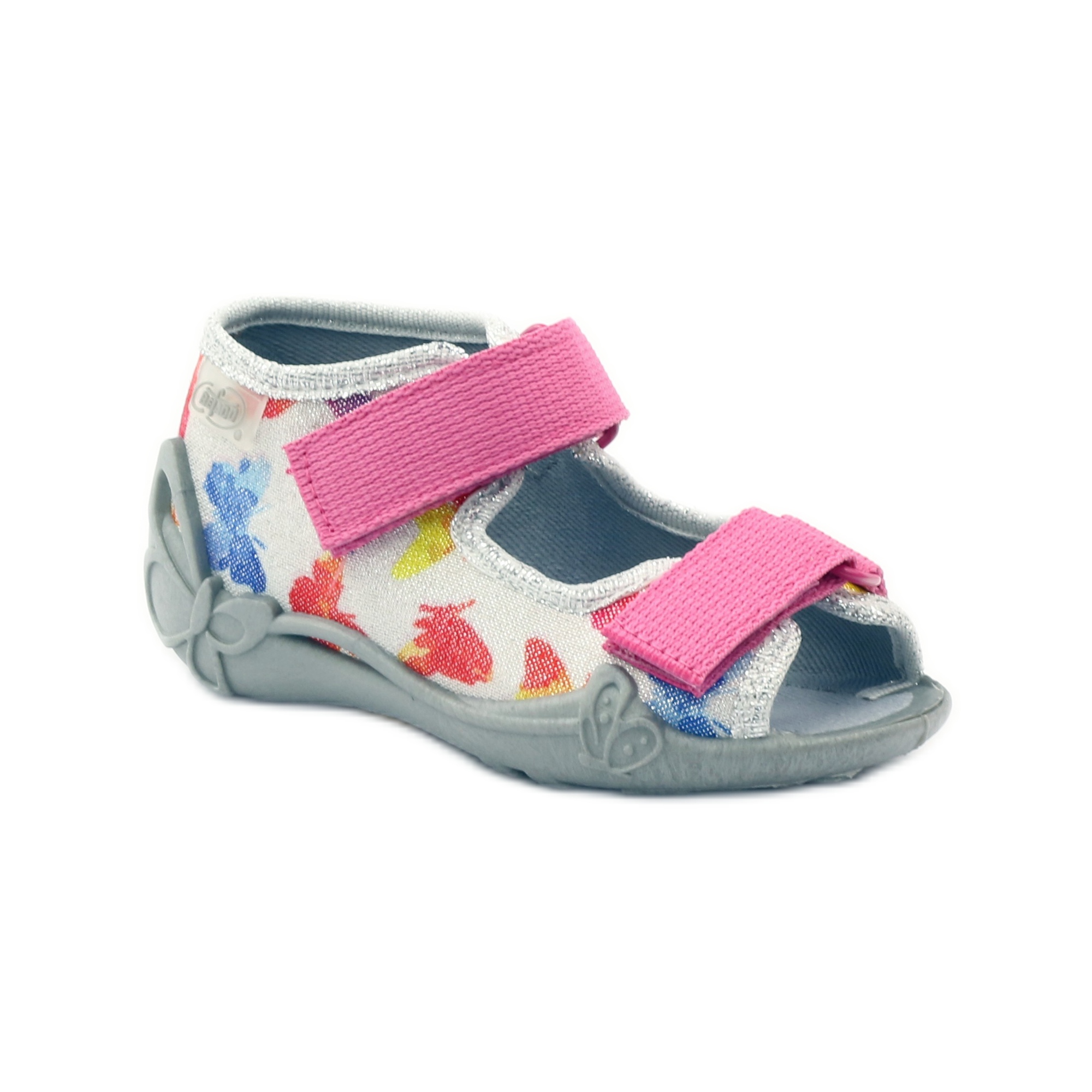 Befado modell sandaler. 242P075 är ett utmärkt val för små flickor som värdesätter komfort och stil. Dessa rosa och gråa tofflor, dekorerade med charmiga fjärilsformade applikationer, kommer säkert att tilltala varje liten fashionista.