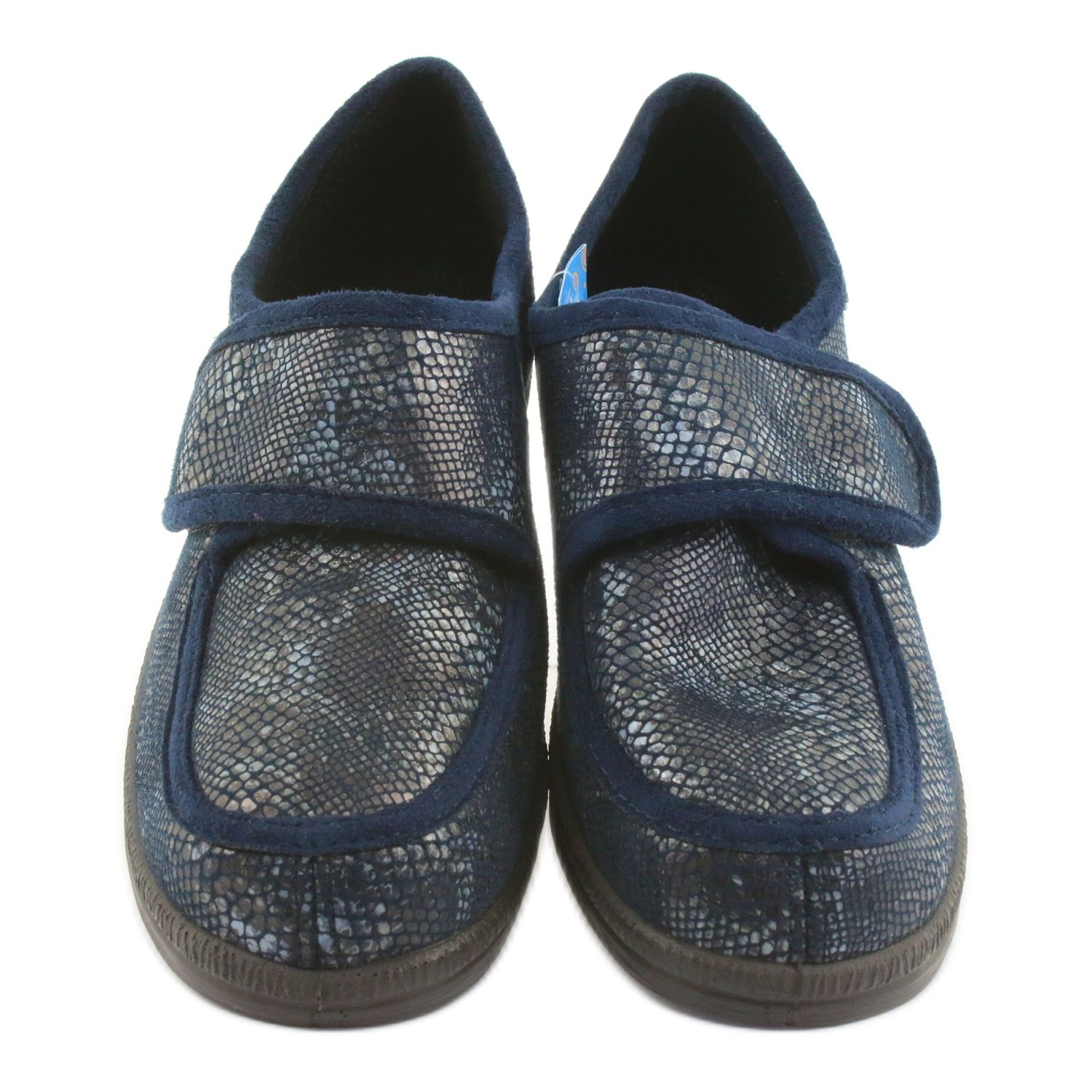 Här finns eleganta och funktionella Befado pu 984D015 damskor i marinblått, som kommer att passa perfekt både hemma och under vardagliga promenader utomhus. Tack vare användningen av ett stretchigt, elastiskt material på ovandelen anpassar sig tofflorna till fotens form, vilket är särskilt viktigt för personer med hälsoproblem, som fotdeformiteter.