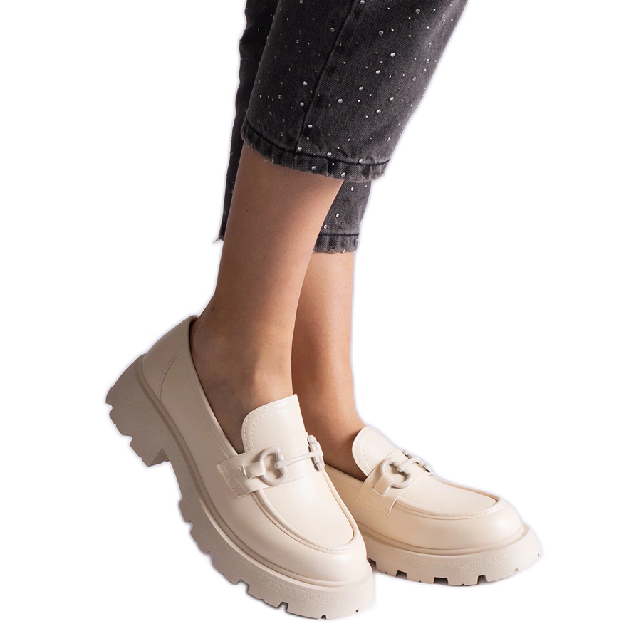 Mockasiner kännetecknas av en subtil beige -nyans, som lätt är integrerad i olika stiliseringar, från avslappnad till mer elegant. Attraktiv gyllene dekoration i form av en kedja ger dem en unik karaktär och gör att varje produktion blir en mode accent.
