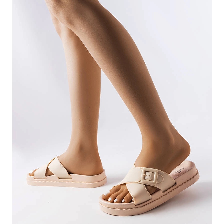 Pauline beige gummiflip-flops med spänne är kvintessensen av sommarstil kombinerat med komfort att bära. Det här är perfekta skor för kvinnor som värdesätter komfort och universell design, som kan se bra ut både under promenader på stranden och i stadens liv och rörelse.