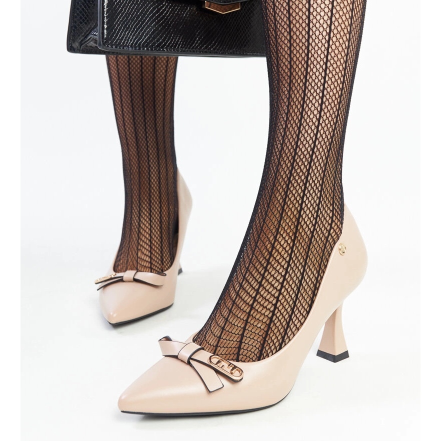 Höjdhöjden på 7,5 cm gör pumparna perfekta både dagligen och för mer formella tillfällen. Tillverkad av högkvalitativa material, inklusive ekologiskt läder och naturläder i insatsen, säkerställer komfort hela dagen. En ytterligare smak är en charmig båge som betonar den feminina karaktären hos denna modell.