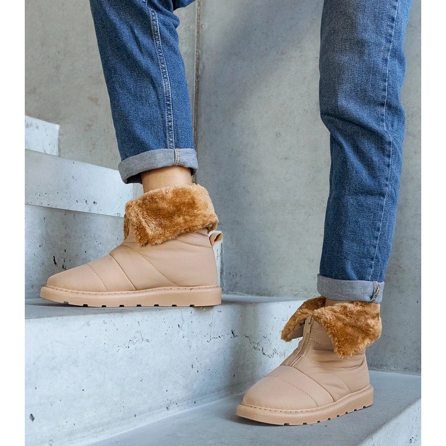 Upptäck de perfekta skor för vinterdagar - beige isolerade snöstövlar med Edidd -krage. Dessa snygga snöstövlar kombinerar fashionabla design med praktiska lösningar, vilket garanterar komfort och värme även på de mest kalla dagarna. Den höga plattformen med en höjd av 3,5 cm ger dem en modern karaktär, och den runda näsan lägger till lätthet och klass.