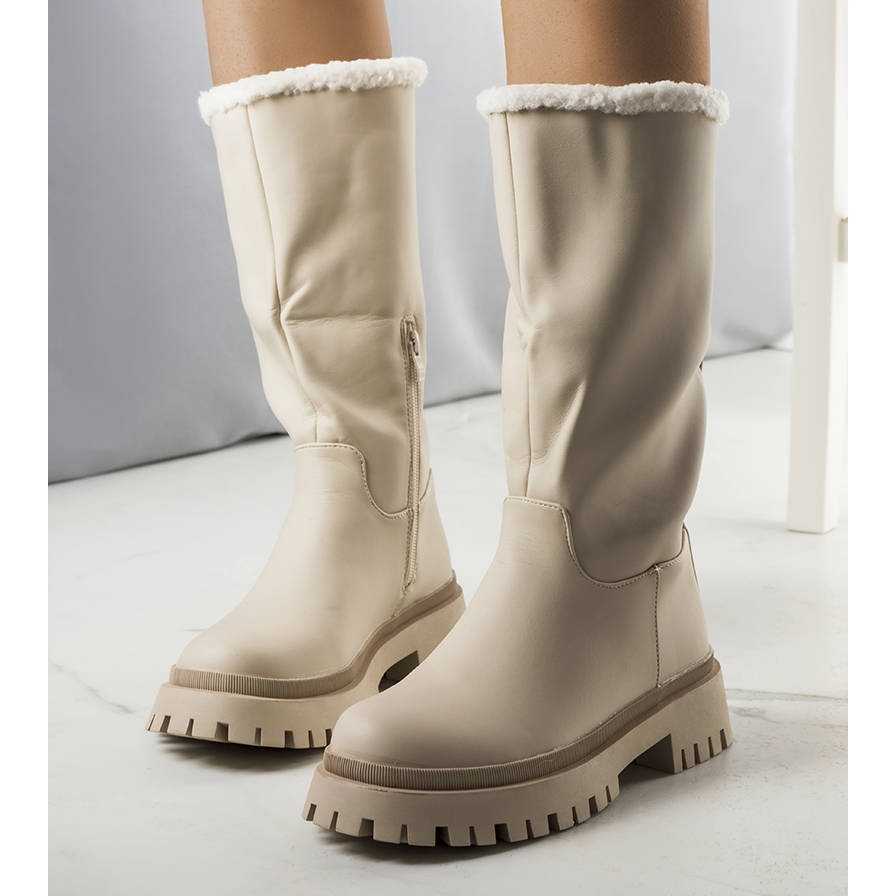Kangas-modellen, tillgänglig i storlekarna 36 till 41, kännetecknas av ett klassiskt snitt som kommer att vara en utmärkt bas för många stilar. Den beige färgen och den runda tån ger subtilitet, och den 5 cm platta hälen gör dem bekväma för dagligt bruk. Den övre bredden på 17,5 cm gör att stövlarna passar bra till olika silhuetter.
