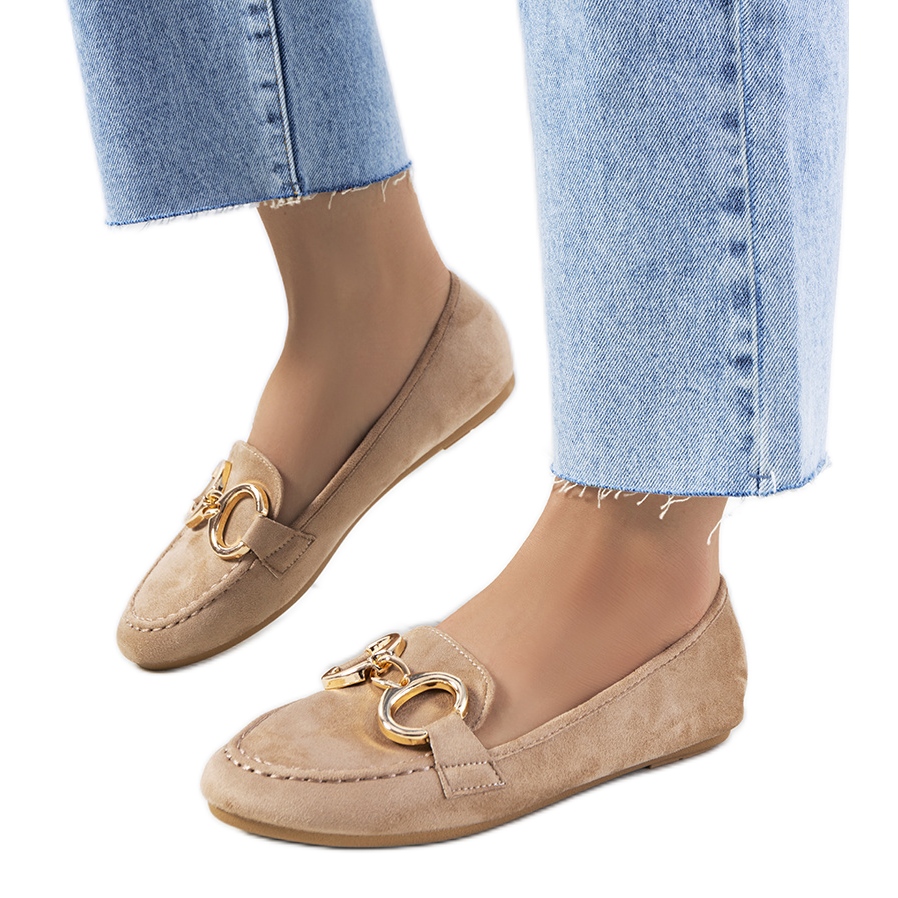 Klassiska loafers i en universell beige nyans, gjord av högkvalitativ mocka ekologiskt läder. Ett subtilt dekorativt spänne med en kedje accent lägger till stil, samtidigt som skosens minimalistiska karaktär. Perfekt för arbete, för möten och varje dag.