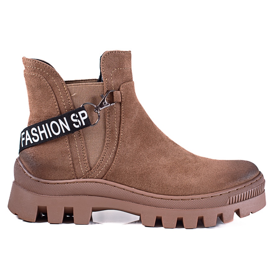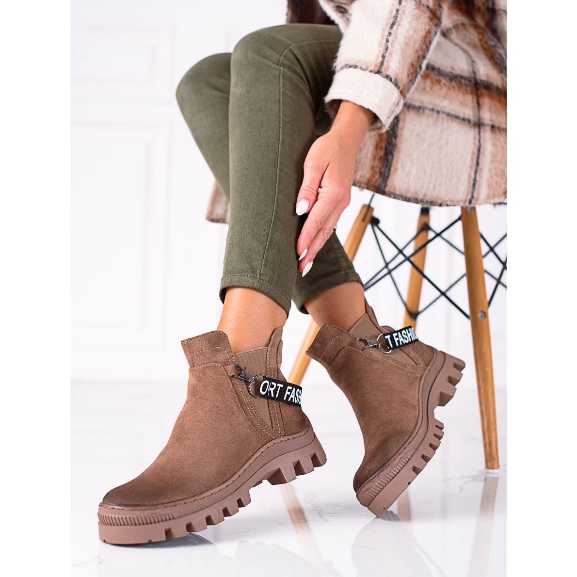 Modellen som finns i nyansen Dk.beige är gjord av ekologiskt mockaläder, som inte bara attraherar ögat, utan också säkerställer komfort i vardagsbruk. Den övre höjden på 12 cm täcker vristen perfekt och hälen är förstyvad, vilket garanterar stabilitet och komfort att bära.