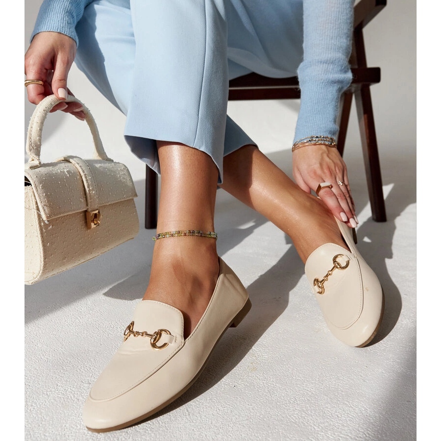 Dessa loafers har en vacker, beige färg som går perfekt med olika stiliseringar. En ytterligare fördel är detaljerna i form av en kedja som ger dem en unik karaktär. Höjdhöjden på endast 1 cm gör dem mycket bekväma att bära hela dagen, och den bruna plastsulan garanterar hållbarhet och stabilitet.