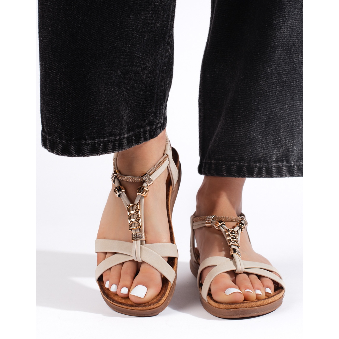 En platt häl med en höjd av 3 cm gör sandalerna bekväma hela dagen, och en slät plastsula säkerställer stabilitet och hållbarhet. Den erbjudna beige färgen går perfekt med andra nyanser, vilket gör dem till ett mångsidigt element av garderob.