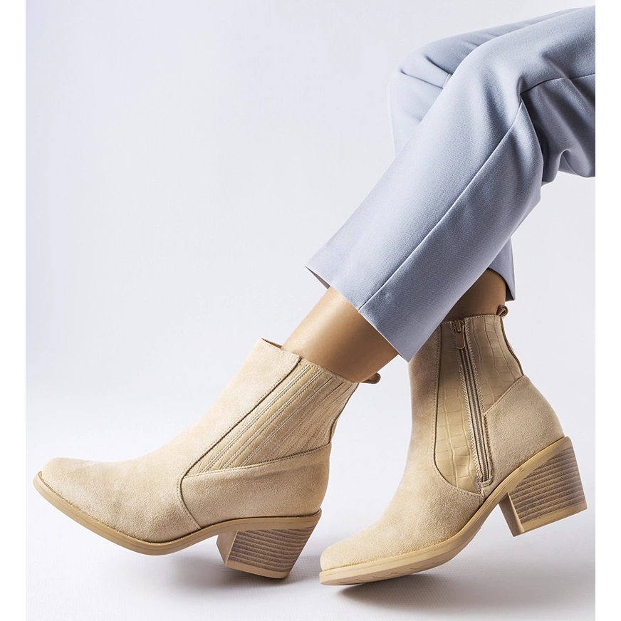 Klassiska och moderna beige stövlar av ekologiska mocka är ett universellt måste i en kvinnoarderob. Den höga snittet och den spetsiga näsan ger dem en feminin, något rovdjur, tack vare vilken de perfekt kommer att komplettera både avslappnade jeans och en elegant kjol eller klänning. Det låga, stabila stolpen (4 cm) säkerställer komfort hela dagen, och sidlåsarna tillåter snabba och bekväma att sätta på.