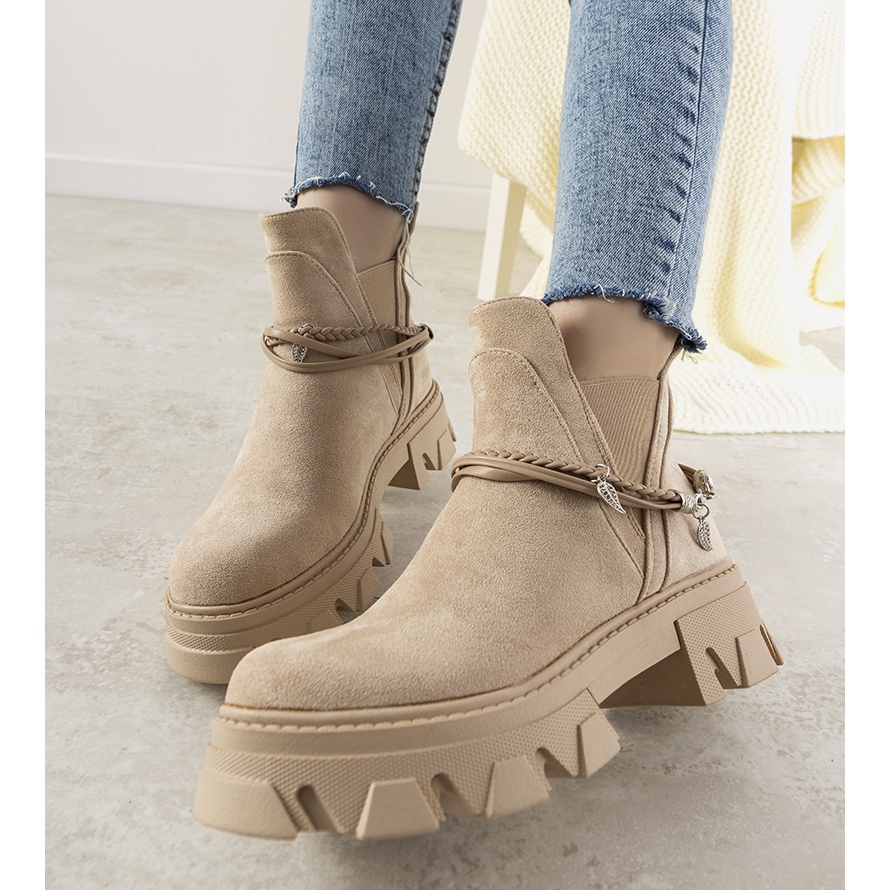 Upptäck den unika charmen med beiga stövlar med ett Fearless-armband, som är det perfekta komplementet till alla höst- och vinterstylingar. Tillverkade av miljövänligt mockaläder kombinerar dessa unika ankelboots elegans och komfort, och erbjuder en rund tå med en lätt distressed effekt för en distinkt stil.