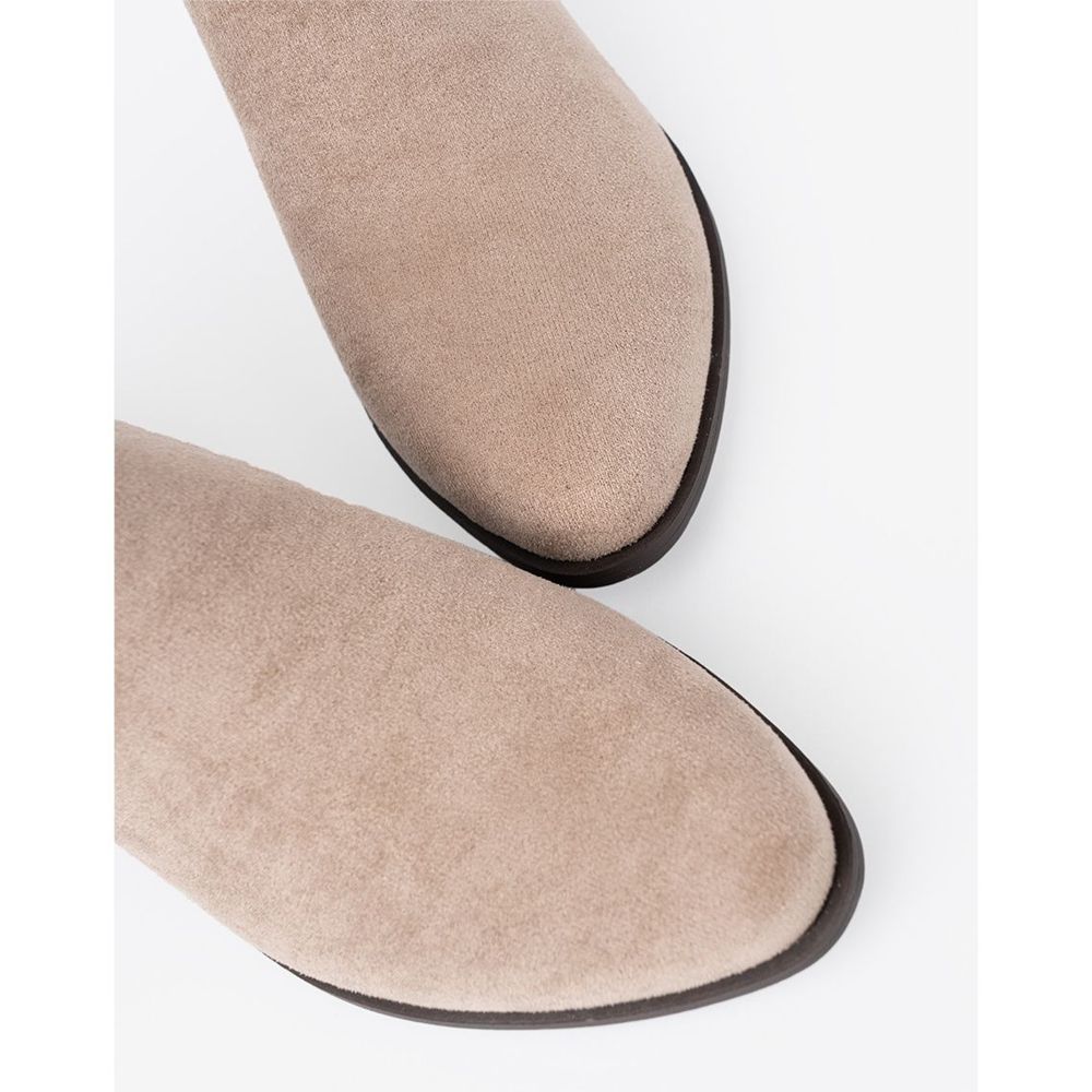Beige -färgen på dessa stövlar får dem att smälta väl med olika kläder - från jeans, till kjolar, till klänningar. Med bredden på den övre av 22 cm och en höjd av 11 cm passar stövlarna perfekt på benen, och 3 cm häl tillför elegans utan förlust av komfort.