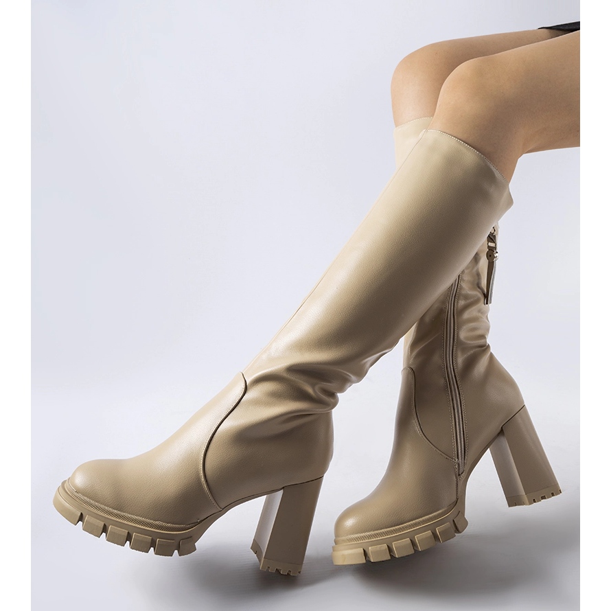 Detaljer: Beige varma långa högklackade stövlar