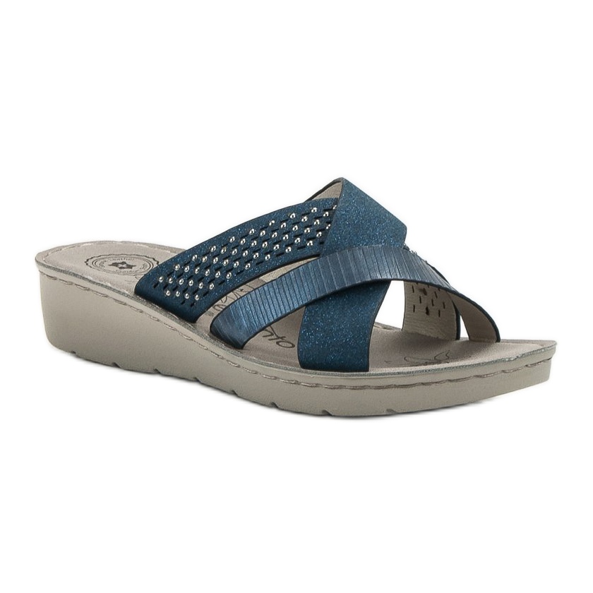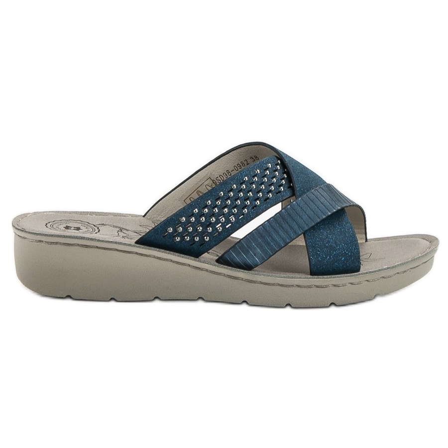 Denna modell kännetecknas av en 4-centimeters kil, som ger en smalare siluett och samtidigt ger tillräckligt stöd när du går. Den öppna hälen och slip-on designen gör att du tar på dem snabbt och bekvämt. Dessutom ger den blå färgen med subtila strass dem en moderiktig karaktär, vilket gör dem till ett perfekt val för byxor, klänningar och shorts.