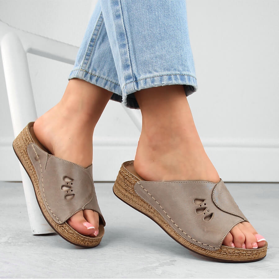 Deras infogade design gör dem extremt praktiska, perfekta dagligen. Tack vare den tjocka, 4,5 centimeter kilen, erbjuder de stabilitet när de går, och tillför samtidigt lite höjd, vilket optiskt smalt figuren. Läderinsatsen och foder garanterar komfort under dagen, och naturliga material ger tillräcklig ventilation, vilket är särskilt viktigt på varmare dagar.