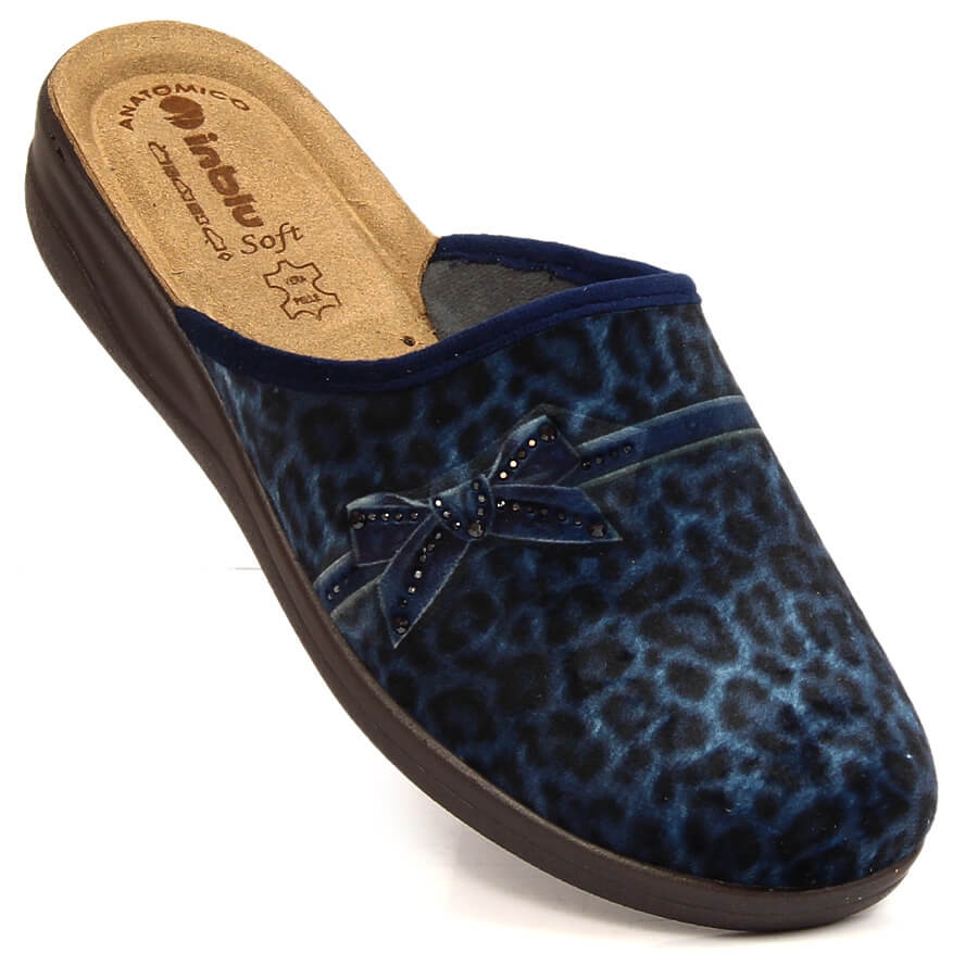 Detaljer: Bekväma kvinnors marinblå Inblu tofflor med leopardtryck
