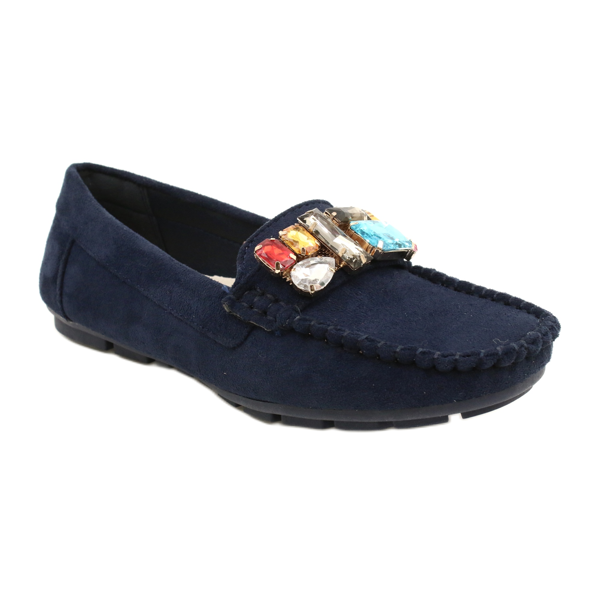 Klassiska evento -loafers i en elegant, marinblå marinskugga är ett förslag för älskare av enkla, eleganta lösningar varje dag. Den övre delen av mocka ekologiskt läder är trevligt att beröra och ger skorna en subtilt lyxig karaktär, och den känsliga dekorationen från zirkonen ger dem stil utan överdrift. Den infogade strukturen och den runda tån gör skor praktiska och enkla att använda.