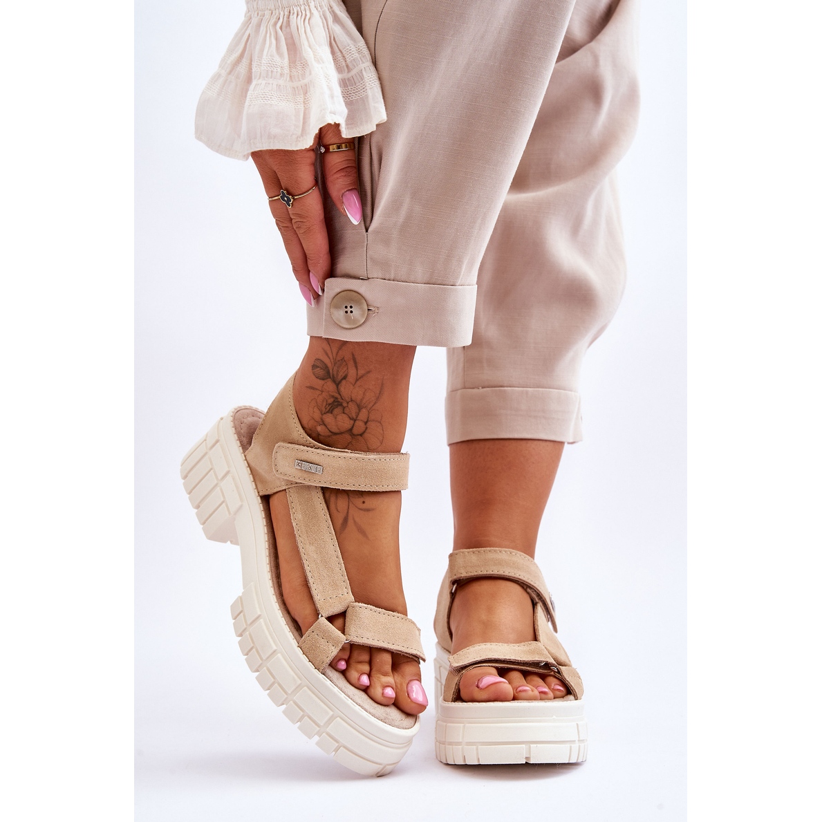 Dessa sandaler är gjorda av naturlig mocka och kännetecknas av en mjuk innersula i eko-mocka som garanterar komfort även under långa promenader. Modellen monterad på en 3,5 cm hög plattform och en platt klack (5,5 cm) gör dem inte bara snygga, utan också stabila. Kardborreknäppningen gör den lätt att ta på och anpassa efter foten, vilket gör dem till en praktisk lösning för alla tillfällen.