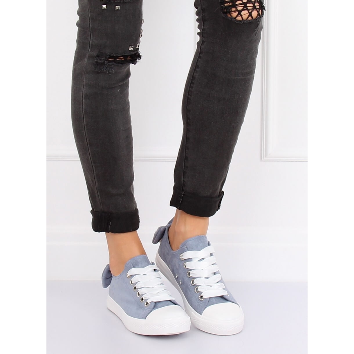 Upptäck charmen med blå B88 Blue sneakers för kvinnor - unika skor som kommer att ge karaktär till varje styling! Deras unika design gör dem till en dekoration i sig. Olika detaljer, som en charmig rosett med en pärla på ryggen och strassprydda öglor, väcker uppmärksamhet och gör att dessa sneakers sticker ut från andra modeller.