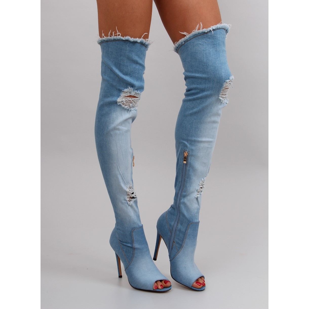 Sensuell, feminin och mycket moderiktig - musketörer med öppen tå är ett förslag för kvinnor som gillar att väcka uppmärksamhet. Tillverkade av elastisk denim med elastan, de passar perfekt till benet, vilket framhäver figuren. En smal 11 cm hög stilett ger elegans och förlänger benen, och den invändiga dragkedjan gör den lätt att ta på. En iögonfallande finish med skavsår/hål gör denna modell till en unik stylingaccent.
