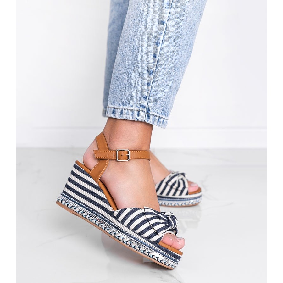 Upptäck sommarens charm med Dulce kilsandaler i blått och vitt! Detta är en unik modell som kombinerar klassisk design med fashionabla accenter. Ovandelen är dekorerad med ett intressant randigt mönster och glänsande paljetter, och en subtil rosett tillför sofistikering till helheten. Dessa sandaler är inte bara iögonfallande, utan kommer också att perfekt komplettera alla sommarstylingar.