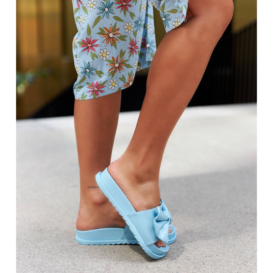 Vi presenterar blå flip-flops med en Servigliano-rosett, som perfekt kommer att komplettera alla sommarstylingar. Dessa eleganta och bekväma flip-flops, skapade med kvinnor i åtanke, sticker ut med sin fashionabla design och högkvalitativa utförande.